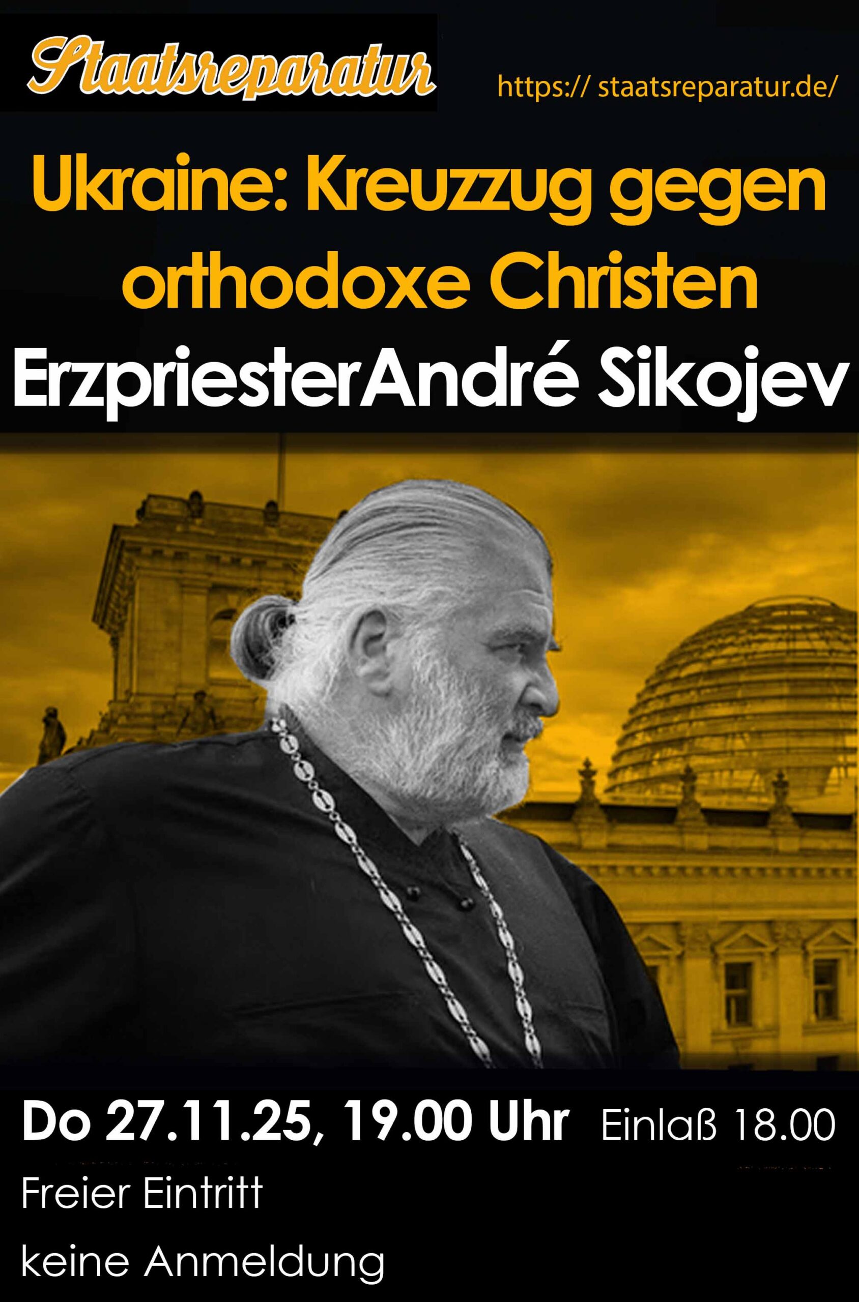 Autor und Filmproduzent André Sikojev, Erzpriester der Berliner Kirche „Schutz der Gottesmutter“ gibt Auskunft über den Kampf gegen das orthodoxe Christentum in einem Land, dessen Regierung Krieg gegen die eigene Bevölkerung führt.
